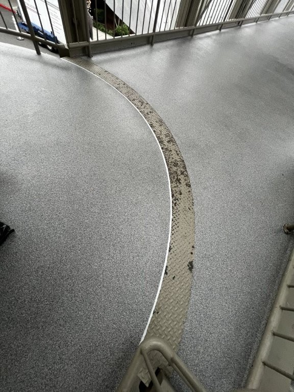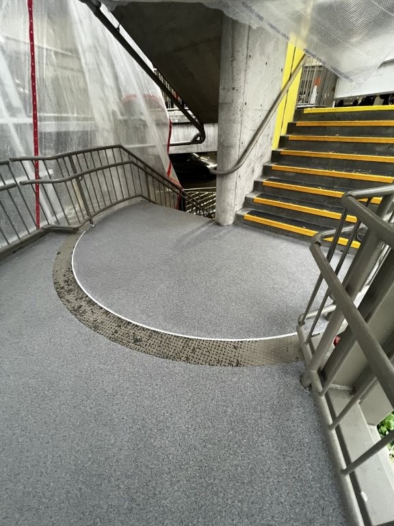 Curved section of the Bellevue Square Skywalk featuring fresh resinous flooring near a stairway with yellow safety striping and metal handrails.