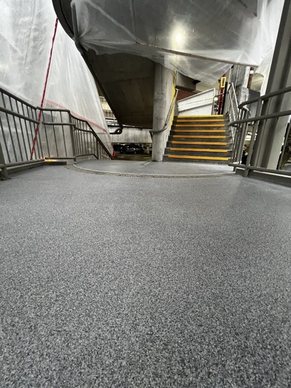 Newly installed resinous flooring on the Bellevue Square Skywalk, showing the textured gray surface and surrounding metal railings.